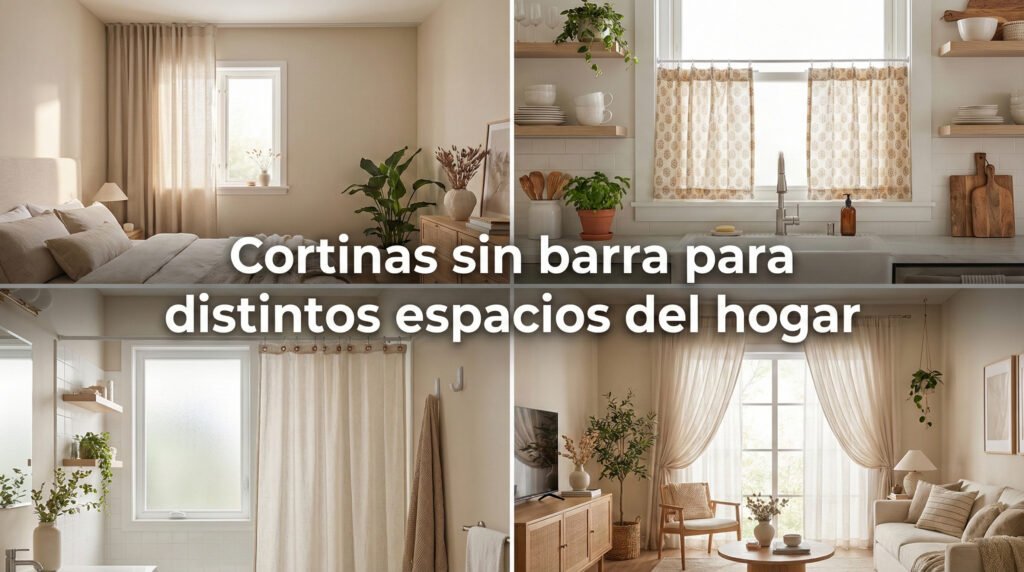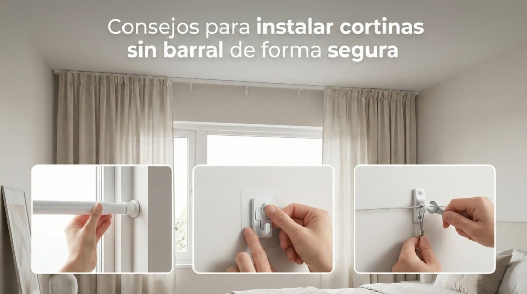 Los rieles plásticos autoadhesivos revolucionan las cortinas sin barra tradicional completamente. Se pegan directamente al techo o pared superior sin perforaciones. Las cortinas se deslizan mediante ganchos o clips especiales incluidos. El sistema resulta prácticamente invisible una vez instaladas las cortinas. Los precios rondan 25 euros por metro lineal instalado.