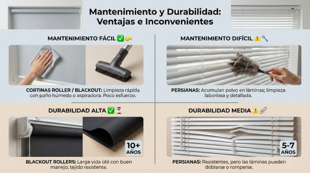 La vida útil depende del mantenimiento del objeto. Las cortinas blackout, si se mantienen bien, pueden durar años. Sin embargo, su tela estará sujeta a desgaste y será robusta en caso de estructura. Evitar los errores al elegir cortinas, como seleccionar el tamaño incorrecto o una tela inadecuada para el ambiente, es clave para garantizar su durabilidad. Las persianas de alta calidad pueden durar muchos años. Pero sus partes mecánicas pueden desgastarse, por lo que tienen que cambiarse. En resumen, la durabilidad a largo plazo depende completamente de la calidad que elijas y de cómo la mantengas.
